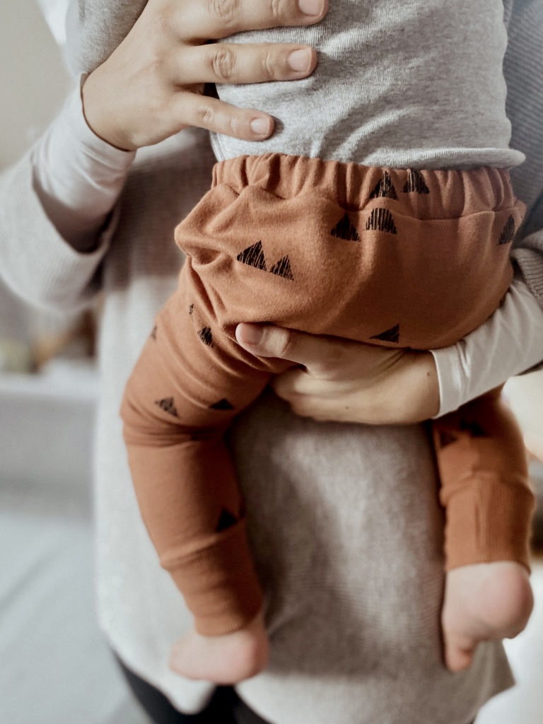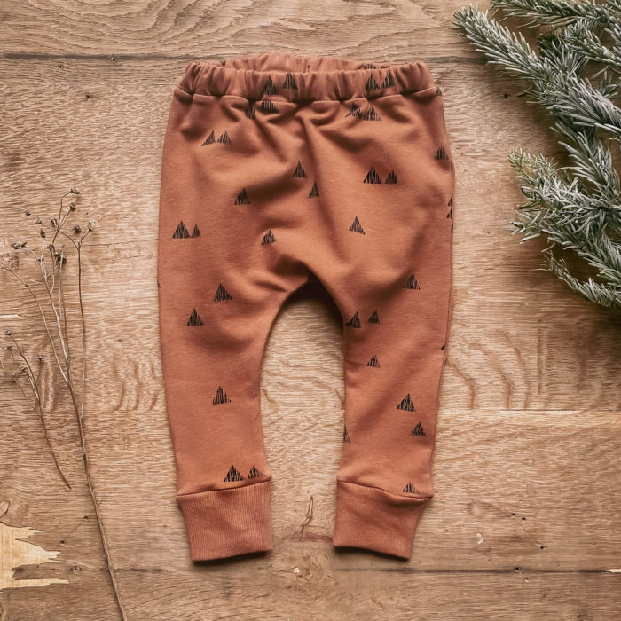 Kalhoty z příjemné měkké teplákoviny hnědé barvy s jemným vzorem trojuhelníkových kopců.