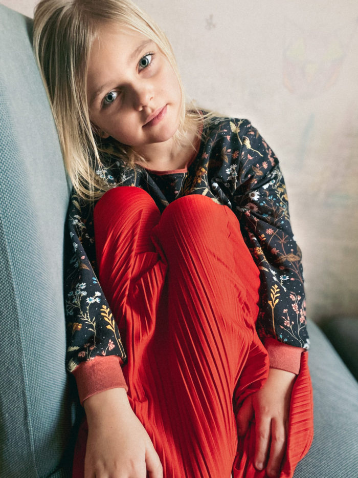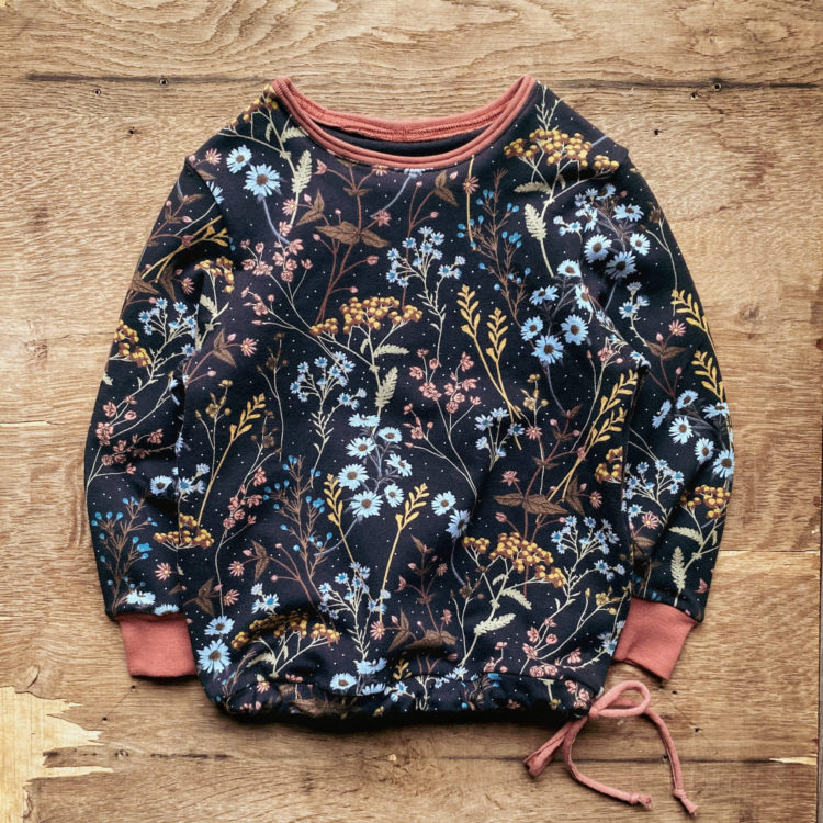 Mikina z příjemné měkké teplákoviny (95% bavlna, 5% elastan) tmavě šedé barvy s jemným vzorem sušených květů.